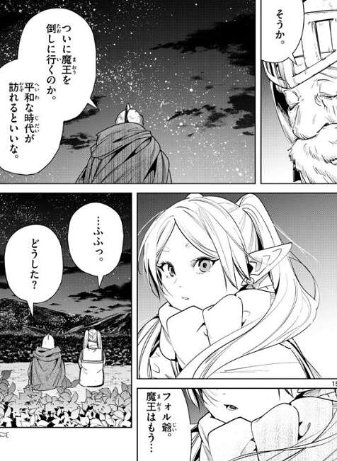 フリーレンはフォル爺さんに、魂の眠る地(オルオール)を目指している事、それは魔王城のあるエンデである事を伝えます。するとフォル爺さんは、そうか、ついに魔王を倒しに行くのか、平和な時代が訪れるといいな、とフリーレンに言います。フリーレンは、フォル爺、魔王はもう…、と途中まで言いかけます。