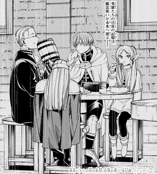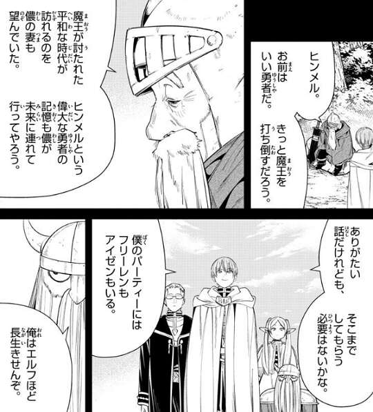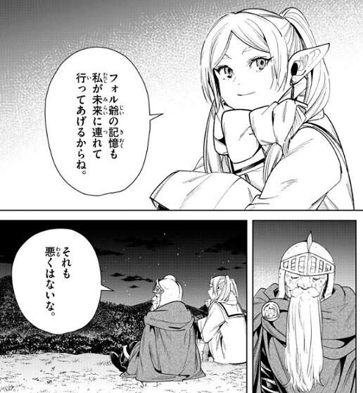 フォル爺さんの妻は人間だったようですが、詳しく話すつもりはないと言い、どうせあの女性の、顔も声も眼差しも伝わらん、これは儂だけの思い出だ、と話します。フォル爺さんは死者との約束を守っている自分を滑稽だと言いますが、約束を守ってくれている事を嬉しく思っているはずだ、とヒンメルはフォル爺さんに言います。その言葉を聞き、いい勇者だ、きっと魔王を打ち倒すだろう、とフォル爺さんはヒンメルを称賛し、ヒンメルという偉大な勇者の記憶も儂が未来に連れて行ってやろう、と言います。しかし、ヒンメルはフォル爺さんの申し出を断り、フリーレンが僕達の記憶を未来に連れて行ってくれる、と言います。