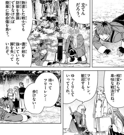 そしてフリーレンはフォル爺と再会しますが、歴戦の老戦士って感じで格好良いでしょ、とフリーレンは言いますが、シュタルクからは、よぼよぼじゃねーか…、と言われてしまいます。しかしシュタルクが油断していると剣で足を払われ、シュタルクは倒されてしまいます。立てんだろう、熟達した戦士でも防御を意識できなければ簡単に致命傷を負う、儂が剣を抜いていたら足を失っていたぞ、とシュタルクはフォル爺から注意されます。フリーレンは、相変わらず卑怯な戦法だね、とフォル爺に皮肉を言いますが、フォル爺は気にせずフリーレンを歓迎します。