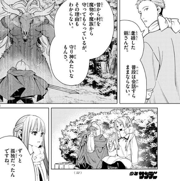 その後、フリーレン達は村で宿を取り滞在するための仕事を紹介してもらいます。小さな村で依頼を引き受けてくれる人がいなかったようで、村人からは助かったよ、と礼を言われます。村人はフォル爺さんの事を、耄碌した爺さんだ、普段は会話すらままならない、昔から村を魔物や魔族から守ってもらっているが、その理由もわからない、守り神みたいなもんさ、と教えてくれます。フリーレンと楽しそうに会話するフォル爺さんを見てフェルンは、ずっと孤独だったんですね、とフォル爺さんを思いやります。