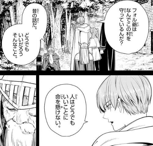 村について一週間、シュタルクはフォル爺さんに稽古をつけてもらいながら、フリーレンはフォル爺さんと話を楽しんでいました。フリーレンは、今ではとても感謝しているんだよ、フォル爺は私がヒンメル達を知る機会をくれたから、とフォル爺さんに言います。そして、ヒンメル達と魔王を倒す旅をしていた頃、フォル爺さんと会った時の事をフリーレンは思い出します。ヒンメルはフォル爺さんに、なんでこの村を守ってるんだ?と質問しますが、昔の話だ、どうでもいいだろうそんなことは、とフォル爺さんはあいまいに答えます。ヒンメルが、人はどうでもいいことに命は懸けない、と言うと、儂は妻の愛した村を守っているだけだ、とフォル爺さんは理由を少し話します。