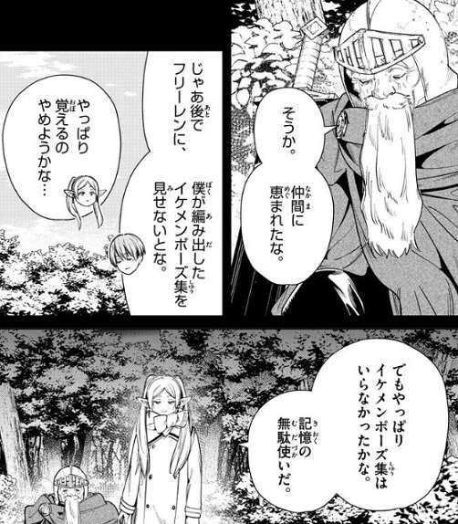 フリーレンは、別にいいけど、と言い、フォル爺さんは、そうか、仲間に恵まれたな、とつぶやきます。ヒンメルは後で僕が編み出したイケメンポーズ集を見せないとな、と言いますが、フリーレンは、やっぱり覚えるのやめようかな…、とやる気をなくします。場面は現在に戻り、フリーレンは、でもやっぱりイケメンポーズ集はいらなかったかな、記憶の無駄遣いだ、とつぶやきます。