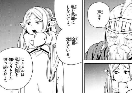 その勇者の顔は覚えているか?と、フォル爺さんから聞かれたフリーレンは、当たり前でしょ、と答えます。声は?と、聞かれると、私を馬鹿にしないでしょ、全部覚えている、ヒンメルは私が人間を知ろうとした切っ掛けだよ、フォル爺さんが村を守ろうと思った切っ掛けと同じで、大切なことだ、とフリーレンは強く口調で答えます。