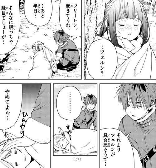 勇者ヒンメルの死から29年後、北側諸国、オッフェン群峰で野営をしているフリーレン達ですが、フェルンが珍しく朝になってもまだ寝ています。フリーレンが寝ているのはいつもの事なのでシュタルクは気に留めませんが、声をかけてもフェルンは起きません。よく見るとフェルンは具合が悪そうで、フリーレンを無理やり起こします。