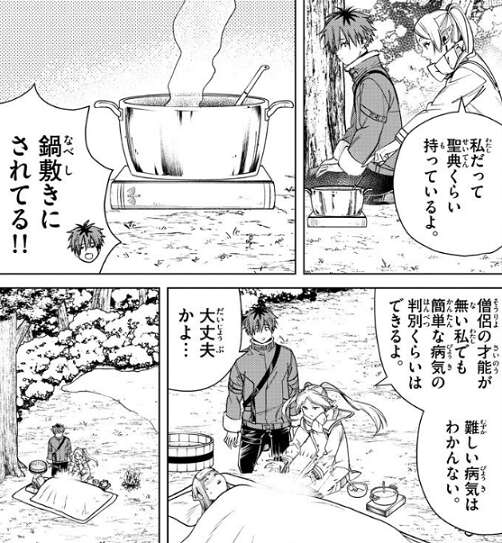 熱があるようで、フリーレンは魔法で病気を判別して対応する薬草を調べようとします。病気の判別は女神様の魔法で聖典の所持者しか使えない事をシュタルクが指摘すると、私だって聖典くらい持っているよ、とフリーレンは言い聖典を取り出します。しかし、フリーレンの聖典は鍋敷きとして使用されていて、シュタルクは不安に思います。