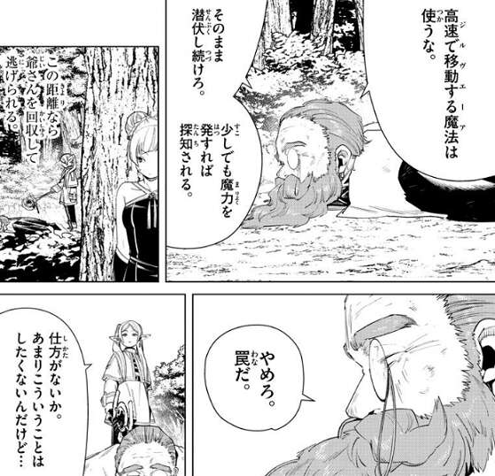 デンケンはラオフェンに、高速で移動する魔法(ジルヴエーア)は使うな、そのまま潜伏し続けろ、と言います。しかし、ラオフェンはこの距離ならデンケンを回収して逃げれると言い、フリーレンがデンケンを痛めつけるそぶりを見せると、高速で移動する魔法(ジルヴエーア)を使います。