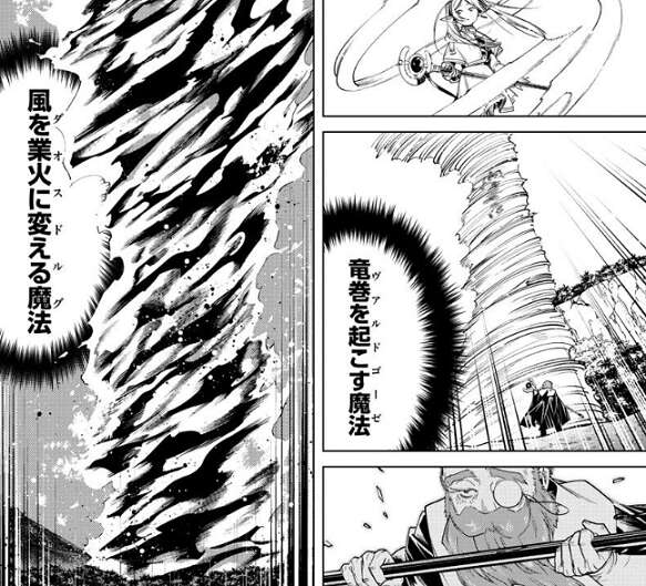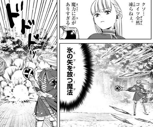 デンケンは派手な魔法を連発し、フリーレンを攻撃しますがフリーレンは防御魔法を使い余裕で魔法を防ぎます。