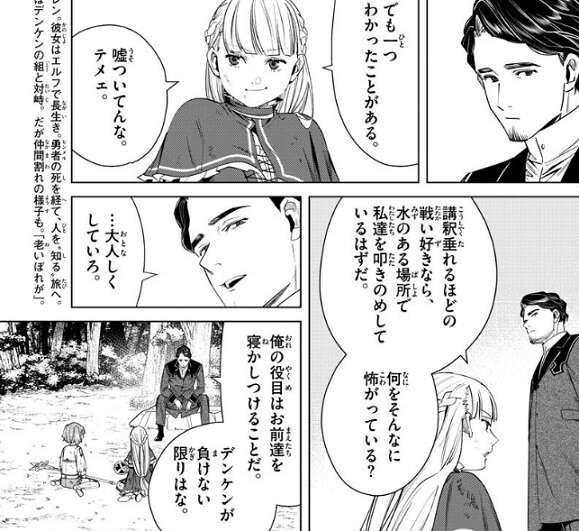 デンケンは、ラヴィーネとカンネを助けに行った方がいいんじゃないか、しかしリヒターはフリーレンと対峙する前にラヴィーネとカンネを殺す、と言いますが、フリーレンは動揺することなくカンネ達が勝つ、と自信をもって言います。さらに、結界の解析が丁度終わった、とフリーレンは言います。
