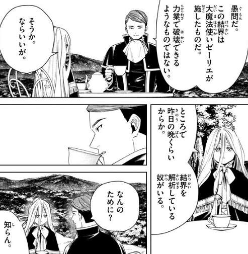 離れた場所から試験官のゲナウとゼンゼはデンケンの魔法を見ていますが、結界は大丈夫なの?と、ゼンゼは一応、結界の心配をします。しかしゲナウは、この結界は大魔法使いゼーリエが施したものだ、力業で破壊できるようなものでない、と答え結界に絶対の自信を持ちます。しかしゼンゼは、昨日の晩くらいから結界を解析している奴がいると、ゲナウに言いますが、ゲナウは無駄な行為と気にしません。