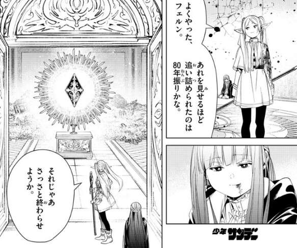 止めを刺したフリーレンは、よくやった、フェルン、あれを見せるほど追い詰められたのは80年振りかな、とフェルンを誉めます。そして、扉の先にいる水鏡の悪魔(シユピーゲル)を倒すと、他の場所にいる複製体は全て崩れて消え去ります。
