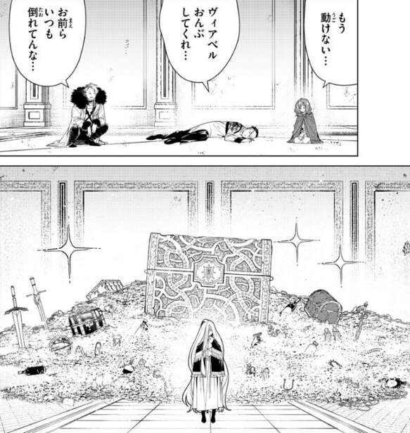 ヴィアベル達は力を出し切ったのか、シャルフとエーレは動けなくなっています。シャルフレは、ヴィアベルにおんぶをしてくれ…、とお願いします。そして、零落の王墓の最深部には宝箱や金銀財宝が多数あり、ゼンゼや生き残った受験者が金銀財宝の前に立っています。