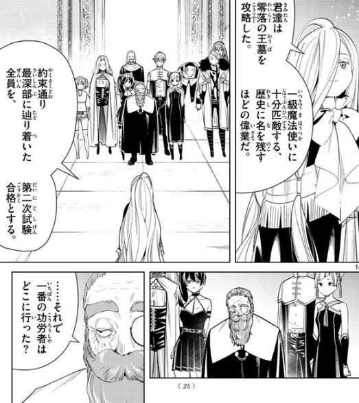 ゼンゼが零落の王墓の最深部まで到達出来た受験者を祝福しています。そして、約束通り最深部に辿り着いた全員に、第二次試験合格を伝えます。それを聞いていたデンケンは、一番の功労者のフリーレンの姿を探します。