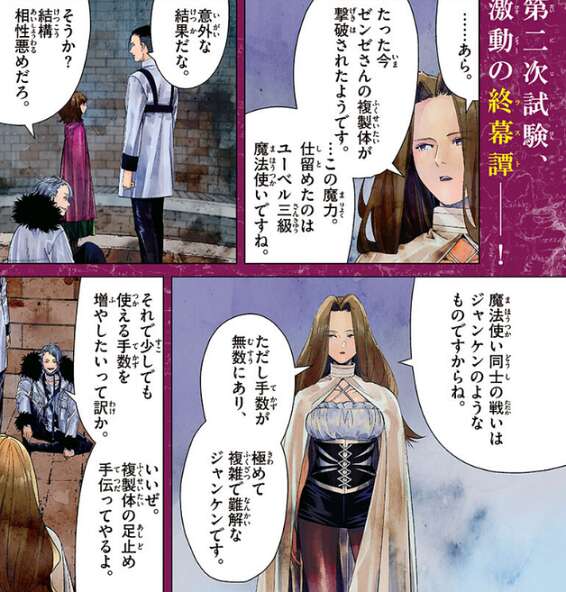 今回で零落の王墓の最深部に到達でき、第二次試験も終了です。最初、倒したはずの複製体が次々と復活し、水鏡の悪魔(シユピーゲル)を倒すまで何度も復活すると判明します。他の受験者は大ピンチとなりますが、フリーレンが体を張って隙を作ったことで、フェルンはフリーレンの複製体に致命傷を負わせ、あと一歩のところまで追い詰めます。しかし、フリーレンの複製体は魔法として認識できない攻撃という、反則級の攻撃でフェルンを一転追い詰めます。最後はフリーレンが止めを刺しましたが、フェルンが本当にフリーレンに勝つには、まだまだずっと先のことになりそうです。