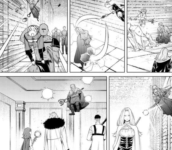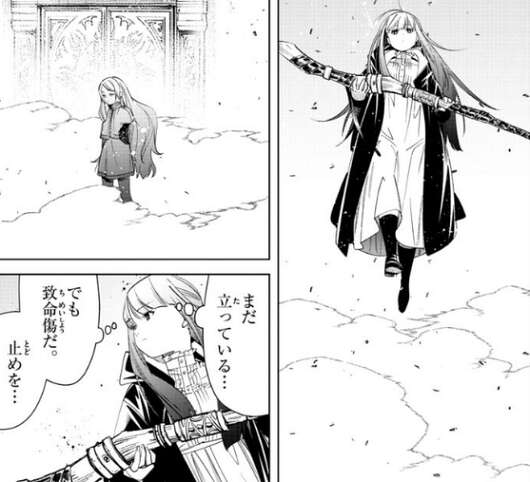 フリーレンが攻撃を受けてダメージを負い、わざと隙を見せると、フリーレンの複製体はさらにフリーレンに攻撃を加えようとします。