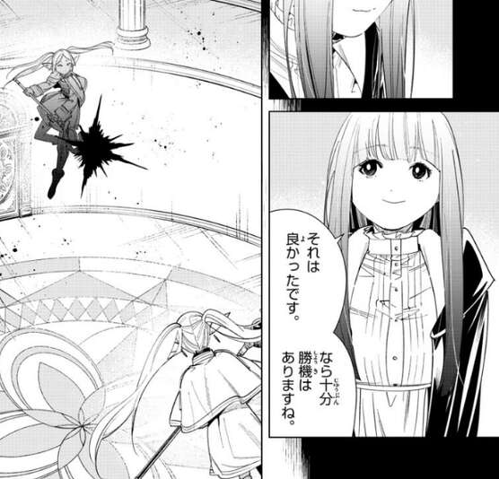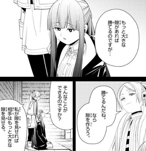フリーレンはフェルンに、フェルンが勝てると思っているのなら勝てる、と断言します。フェルンが、何故そう言い切れるのですか?と、聞くと、だって“私”はフェルンのことをなめているから、とフリーレンは笑顔で答えます。それを聞いたフェルンは、それは良かったです、なら十分勝機はありますね、とフリーレンに言います。