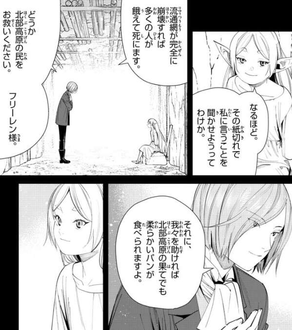 借用書で私に言うことを聞かせようとしてるわけか、とフリーレンが言うと、流通網が完全に崩壊すれば多くの人が飢えて死にます、どうか北部高原の民をお救い下さい、とノルムは頭を下げてフリーレンにお願いします。我々を助ければ北部高原の果てでも柔らかいパンが食べられますよ、とノルムがさらに言うと、したたかな所はノルム卿と変わらないね、まったく、これだから商人は、とフリーレンはあきれますが、どちらにせよ、先々代から受けた恩は返すつもりだったと、フリーレンはノルムの提案を受け入れます。