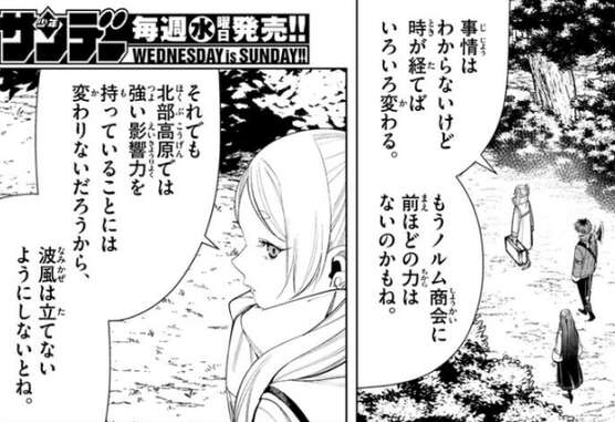 しかし、半日歩くと立派な城塞都市が見えてきました。ノルム商会の所領の城塞都市で、中心にあるのはノルム商会の本部だそうです。ノルム商会はビーア地方の小麦を中心に様々な物資を扱っていて、北部高原に点在する集落に、物資を生きわたせらせるだけの流通網と軍事力を持っている武装商会だそうです。しかし、そんなノルム商会も今では物資を流通させれていないようで、もうノルム商会には前ほどの力はないのかもね、とフリーレンはフェルン達に話します。それでもノルム商会は北部高原では強い影響力を持っている事には変わりないだろうからとフリーレンは、波風立てないようにしないとね、とフェルン達に注意します。
