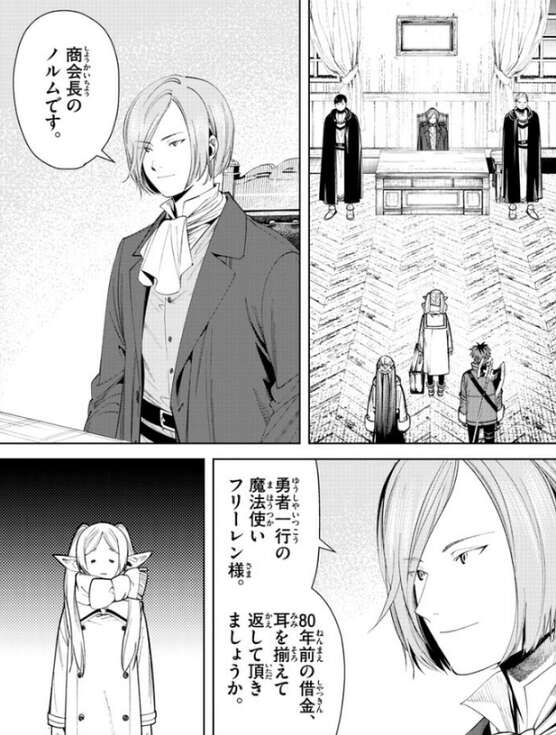 城塞都市に入る手続きをしているとフリーレンの似顔絵が出回っていたようで、フリーレン達は呼び止められてしまいます。そして商会長のノルムの所に呼び出されて、フリーレンは80年前の借金を耳を揃えて返すよう、と言われてしまいます。