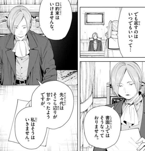 80年前は返すのはいつでもいいと言われていたようで、フリーレンはその事をノルムに言いますが、口約束だったようで書類上はそうなっておらず、先々代はそこら辺りが甘かったようですが、私はそうはいきません、とフリーレンに借金の返済を迫られます。フリーレンは全財産をノルムに見せて、釣りはいらないよ、と言い借金を返そうとしますが、借金返済には全く足りません。