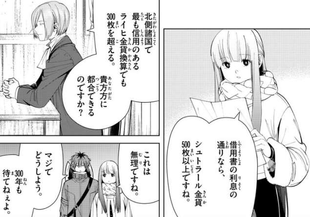 しかし借用書にはシュトラール金貨500枚以上とあり、北側諸国で最も信用のあるライヒ金貨換算でも300枚を超えてしまいます。フェルンやシュタルクでは、とても用意できそうになく、二人は途方に暮れてしまいます。