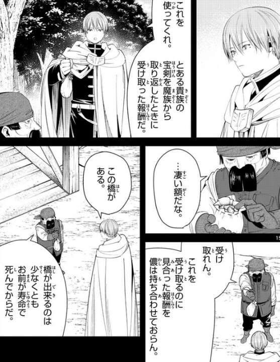 ゲーエンの話を聞き、とある貴族の宝剣を魔族から取り返した時に受け取った報酬を全額、ヒンメルはゲーエンに渡します。しかし、受け取れん、この額に見合った報酬をわしは持ち合わせておらん、とゲーエンは返そうとします。ヒンメルは、この橋がある、と言いますが、この橋が出来るのは少なくともお前が寿命で死んでからだ、とゲーエンは言いヒンメルが生きている間には完成しないと話します。