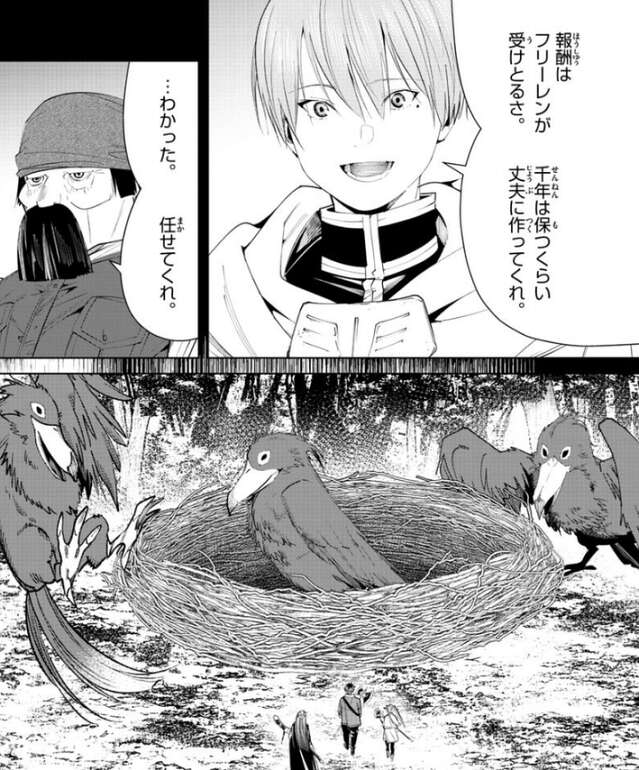 しかし、報酬はフリーレンが受け取るさ、とヒンメルは笑顔で言いお金を使うに言うと、…わかった、任せてくれ、とゲーエンは納得しヒンメルからお金を受け取ることにします。場面は現在に戻り、フリーレン達は鳥の魔物の巣に辿り着きます。大型の鳥の魔物が巣に何羽もいますが、フリーレン達は協力して鳥の魔物を倒すことに成功します。