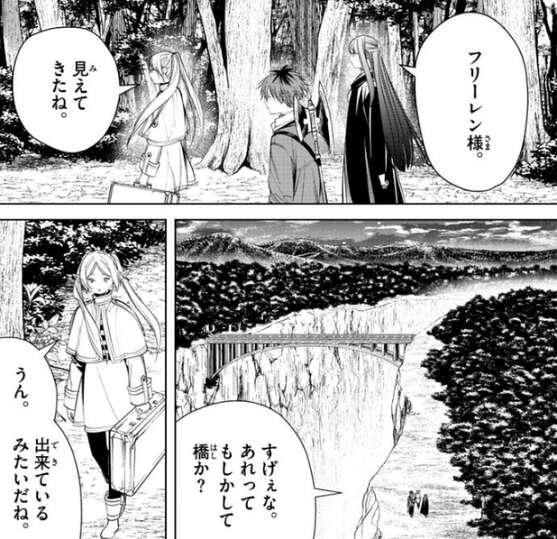 すると、フリーレンは何か心当たりがあるようで、とにかく上流を目指そうか、運が良ければ途中で渓谷を渡れるかも、とフリーレンは言うと、上流の方に歩き始めます。しばらく歩くと橋が見えてきます。