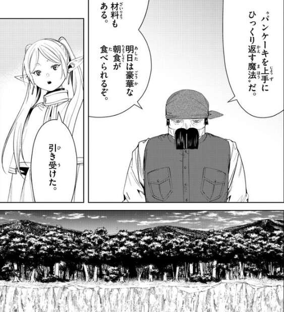 報酬は“パンケーキを上手にひっくり返す魔法”だ、材料もある、明日は豪華な朝食が食べられるぞ、とゲーエンが言うと、フリーレンは二つ返事で依頼を引き受けます。