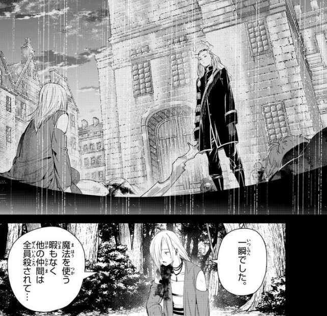 しかし、集合場所ではない場所で負傷したフリュー二級魔法使いと出会います。レルネンはフリュー二級魔法使いに報告するように言うと、黄金郷の内部でマハトと遭遇し、魔法を使う暇もなく一瞬で他の仲間は全員殺された、とフリュー二級魔法使いは報告します。
