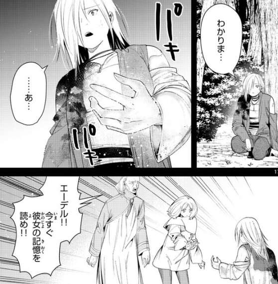 一瞬で他の仲間は殺されたのに、何故 フリュー二級魔法使いだけマハトに生かされたか、レルネンが問いかけると、フリュー二級魔法使いの体が突然、黄金に変わり始めます。黄金に変わる様子を見たレルネンは、今すぐフリュー二級魔法使いの記憶を読むようにエーデルに言います。