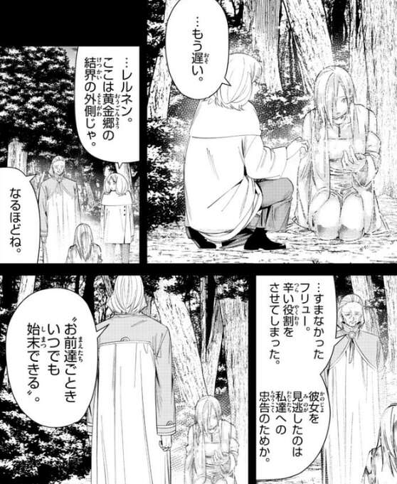 しかしあっという間にフリュー二級魔法使いは黄金に変わってしまい、彼女の記憶を読み取ることは出来ませんでした。フリュー二級魔法使いを結界の外側まで見逃したのは、お前達ごときいつでも始末できる、というマハトの忠告だとレルネンは受け取ります。随分と舐められたもんだね、とレルネンは言うと二人は黄金郷へとさらに進みます。