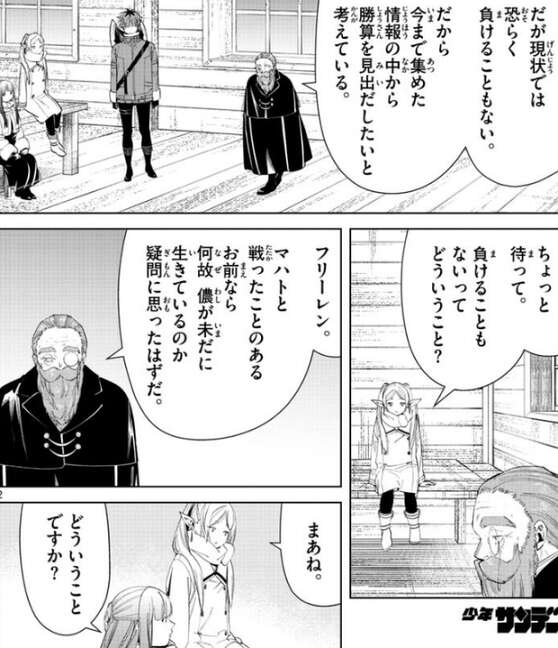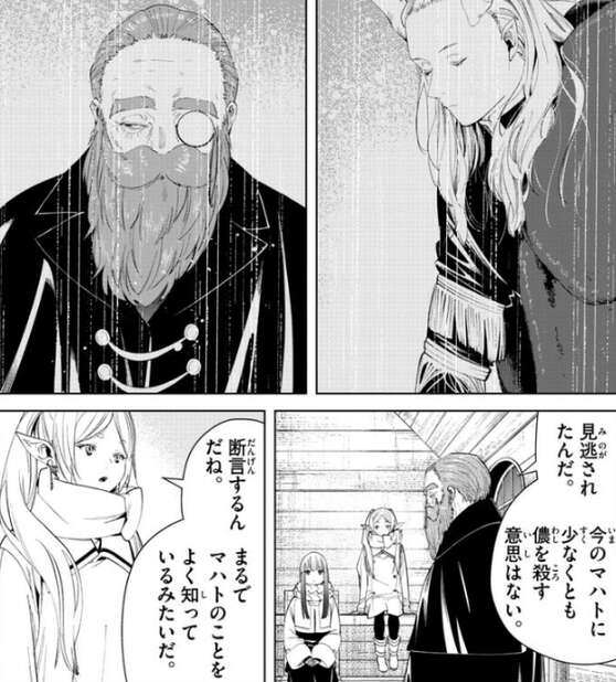 マハトには勝てないと言ったデンケンですが、現状では恐らく負けることもない、ともデンケンは言います。フリーレンはデンケンが黄金郷に入り故郷の村で妻の墓参りをしているのに、デンケンが未だに生きている事に疑問を持っていました。マハトの魔力探知は黄金郷の全域に及び、その探知能力は極めて精密なので黄金郷に入ればマハトに見つかるはずと、フリーレンは考えたようです。