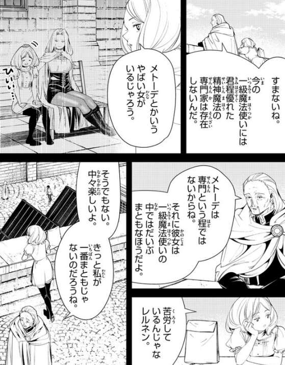 レルネンはエーデルに依頼があると話しますが、エーデルはは働くのは嫌だ、と依頼に乗り気ではありません。エーデルはメトーデとかいうヤバイ女がいるじゃろう、と言います。エーデルはメトーデにあまり良い印象がないようですが、メトーデは精神魔法の精神魔法の専門家という程ではないとレルネンは言い、あくまでエーデルに仕事の依頼がしたいと言います。