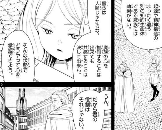 レルネンは黄金郷絡み依頼だとエーデルに言いますが、魔族の心は操れないので精神操作魔法は対人戦でなければほとんど役に立たない、とエーデルは言います。人類と起源や精神構造の全く違う別の知的生命体である魔族には精神操作魔法は効果がないようですが、レルネンはエーデルの役割はそれじゃない、と言います。