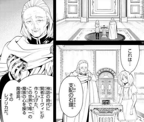 レルネンはある魔道具をエーデルに見せます。その魔道具は支配の石環と呼ばれるもので、神話の時代に賢者エーヴィヒが作り上げた、この世界で唯一の魔族の心が操れる魔道具です。しかし、これはレプリカで実際に魔族の心を操ることは出来ません。