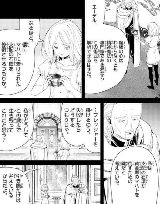 昔、城塞都市ヴァイゼの領主は巨万の富を得るために、マハトに支配の石環を着け、意のままに操ってしました。しかし、後にマハトは反逆し城塞都市ヴァイゼは一瞬で黄金に変えられ滅び去りました。数少ない黄金郷からの生存者の情報から、マハトは未だに支配の石環を着けているようで、レルネンはなんらかの理由で支配の石環に不具合が生じたと考えているようです。そして、この支配の石環のレプリカは魔族の心は操れないが、術式は忠実に再現していて、この術式を解析して欲しいとレルネンはエーデルに頼みます。レルネンは支配の石環がマハトを倒すための鍵と考えていて、エーデルにマハトに着けられた支配の石環を修復してもらう考えです。エーデルはプレッシャーを感じ失敗したらどうするつもりかと言いますが、レルネンは引き際だけは弁えていると言います。