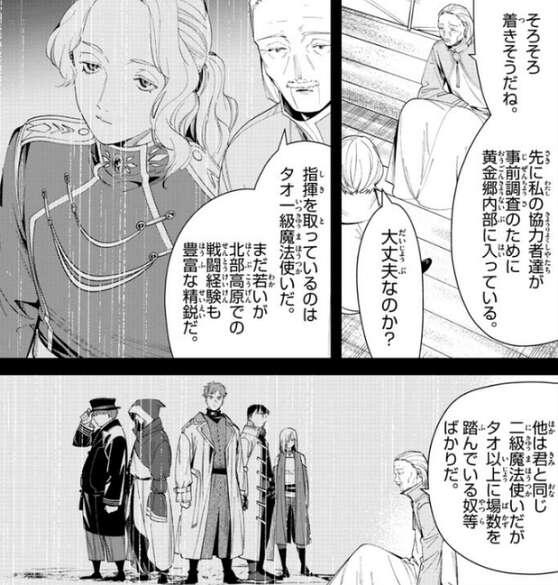 エーデルとレルネンは黄金郷へと向かいます。黄金郷にはタオ一級魔法使いと他、二級魔法使いが数名、事前調査で黄金郷内部に入っていて、まずは彼らから情報の報告を受けよう、とレルネンは言います。