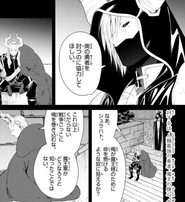 全知のシュラハトはマハトに、南の勇者を討つのに協力してほしい、と頼みますが、魔王軍がどうなろうと知ったことではない、とマハトは協力を拒否します。それでもシュラハトは、魔王様の勅命だ、逆らうのであれば殺さねばならん、とマハトを脅してでも協力させようとします。