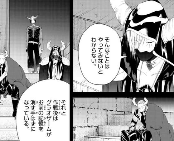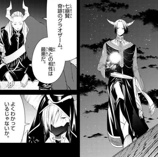 シュラハトが恐怖を使うしかない、と言うと、見せしめというわけか、出来ると思っているのか?と、マハトは言い、シュラハトとにらみ合いになります。結局、未来視が出来るシュラハトが来たという事はマハトが作戦に必要不可欠で、それに逆らうこともできない、とマハトは言い、さらにマハトと相性が最悪な七崩賢・奇跡のグラオザームと来ていて、マハトはシュラハトの作戦に協力する事になります。