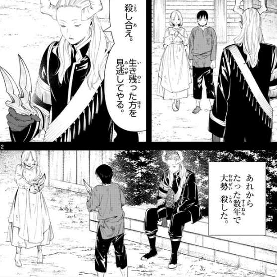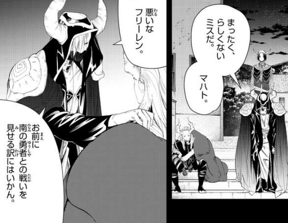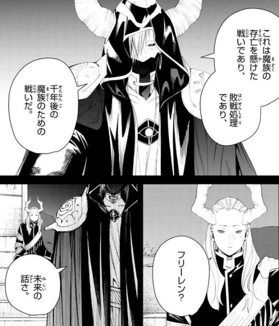 これは魔族の存亡を懸けた戦いであり、敗戦処理であり、千年後の魔族のための戦いだ、とシュラハトは話しますが、フリーレンが誰のことか分からないマハトは話を理解できずにいます。すると、未来の話さ、とシュラハトはマハトに話しかけます。
