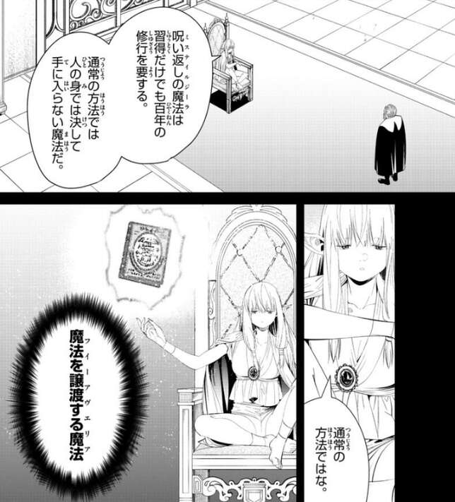 呪い返しの魔法(ミステイルジーラ)を渡すことに、呪いの対抗手段を失ってしまう、とゼンゼはゼーリエに異を唱えますが、ゼンゼは、私を誰だと思っている、呪いへの対策など他にいくらでもある、“特権”は絶対だ、と自分の考えを変えません。それにまた百年かけて学び直せばいいとゼーリエは言い、私にとっては些細なことだ、とゼーリエは呪い返しの魔法(ミステイルジーラ)を失うことを気にしません。