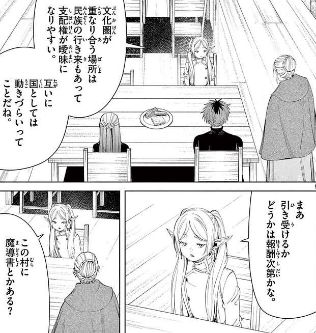 勇者ヒンメルの死から31年後、北部高原、エルンスト地方の農村にフリーレン達はたどり着きました。ヴァイゼの街を出てからあと少しで北部高原を抜けて、北側諸国最大の国・帝国領へと入ります。途中の農村で宿を取ることにしたフリーレン一行ですが、村人から畑を荒らし家畜や野生動物を殺す魔物をどうにかして欲しいと頼まれます。フリーレンは、紙飛行機を遠くに飛ばす魔法の魔導書に釣られて依頼を引き受けますが、畑を荒らしていたのは魔物でなくゴーレムでした。