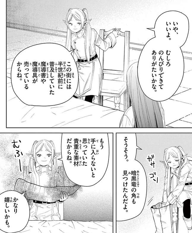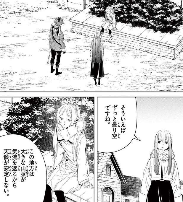 勇者ヒンメルの死から31年後、北部高原、ヴィッセン山脈を登るフリーレン一行の前に、薬草家が現れます。薬草家は空から落ちて来る見た事のない木の実がどこから来るのか、謎を解いて欲しいと依頼されます。フリーレンは村人が晴天の時に空を飛ぶ竜の影を見たという話をシュタルクから聞き、ある竜が関係しているのではと思いつきます。