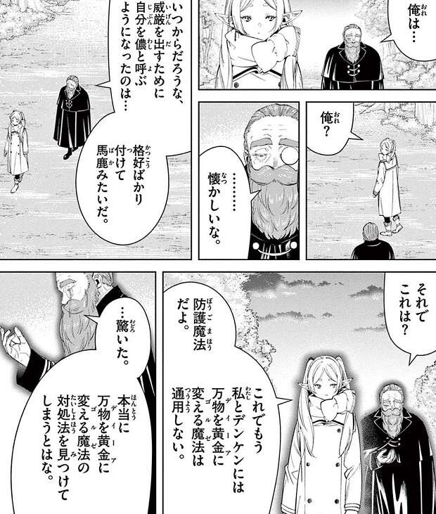 黄金に変えられてしまったデンケンは夢の中で、妻のレクテューレと会話をしていました。夢の中でレクテューレから、最後まで醜く足搔くんでしょ?と、言われたところで、デンケンは目を覚まします。フリーレンは万物を黄金に変える魔法(デイーアゴルゼ)の解除方法を見つけ、黄金に変えられたデンケンの解除に成功し、さらにデンケンに防護魔法をかけて万物を黄金に変える魔法(デイーアゴルゼ)が通用しないようにします。しかし状況はあまり良くなく、フリーレンとデンケンはすぐにマハトとソリテールに捕捉されてしまいます。