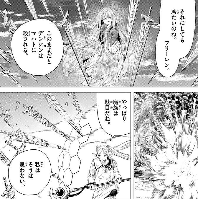 マハトと因縁のあるデンケンはマハトの相手を買って出て、フリーレンはマハトをデンケンに任せ、自分はソリテールの相手をします。最後、デンケンは相討ち覚悟でマハトに高圧縮の人を殺す魔法(ゾルトラーク)を当てて、見事マハトに致命傷を与えます。