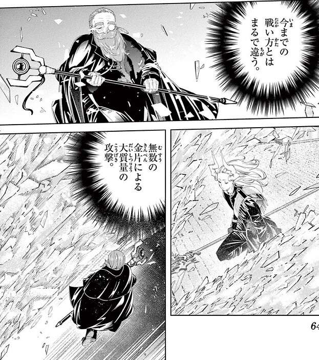 デンケンが使う人を殺す魔法(ゾルトラーク)がマハトに当たり始め、マハトは自分が知る人を殺す魔法(ゾルトラーク)とは最早別物なのだと知ります。マハトは人類の魔法の歴史そのものが自分の相手なのだと気付き、デンケンに対して本気の攻撃を始めます。マハトは自分の回り無数の金片を出現させ、無数の金片による大質量攻撃をデンケンに仕掛けます。