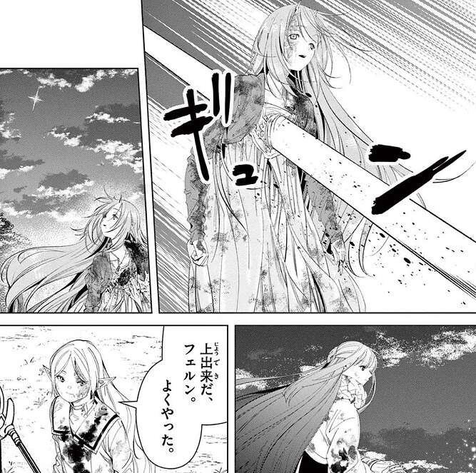 ほとんどの攻撃を防がれて苦戦するフリーレンは、フェルンとシュタルクが生きていると信じてヴァイゼ全体の黄金郷の呪いが解除、黄金に変えられていたフェルンとシュタルクが元に戻り、フェルンがソリテールの隙をついて長距離射撃で致命傷を与えて、フリーレンが止めを刺します。こうしてヴァイゼは約50年振りに黄金の呪いから解放されて、黄金郷のマハト編は完結します。