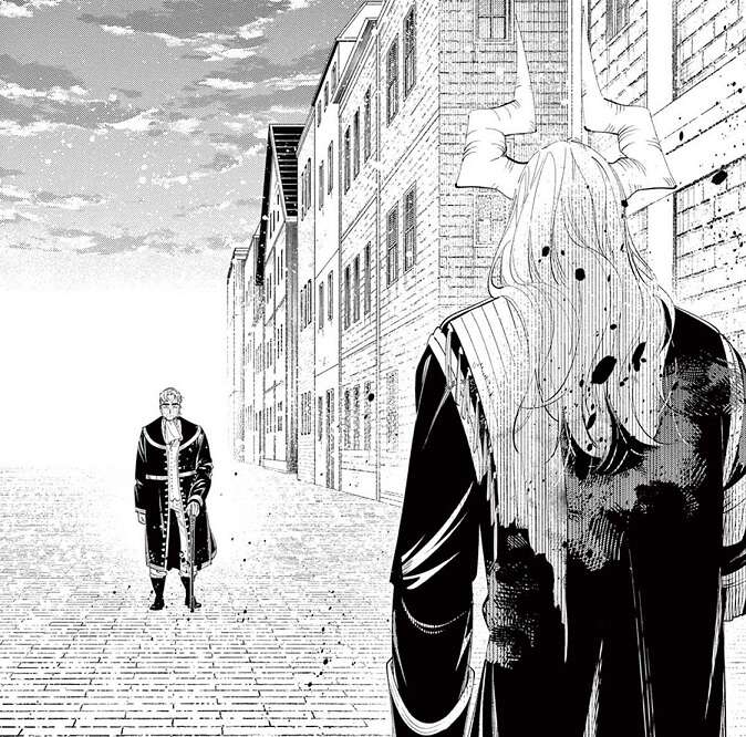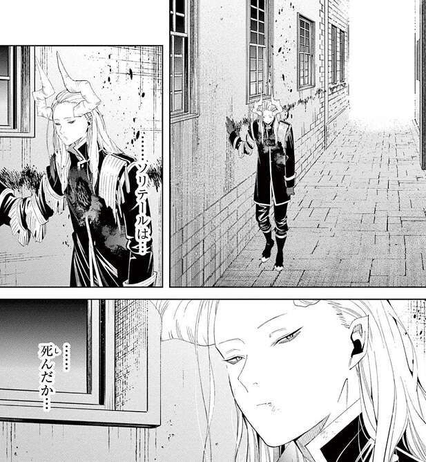 ソリテールとの会話を思い出しながら、魔族の自分を無様なものだ、とマハトは自虐的に言います。知らない感情のためなら、人類との共存のためなら、報いを受けるためなら、死んでもいいと考えていましたが、マハトは他の魔族と同じように無様に逃げていました。自信を自嘲しつつもマハトは逃げ続けますが、その先には黄金の呪いから解放され元に戻ったグリュックが待ち構えていました。マハトは自分も報いを受けるときが来たのだと直感します。