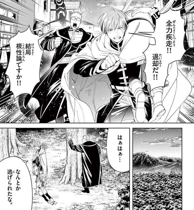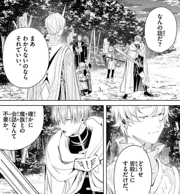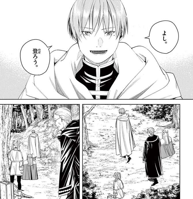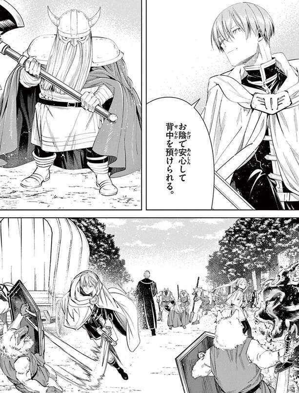 フリーレンの未来への帰還方法を探そうと町で聞き込みをしますが、魔法使いギルドや教会で聞いても手掛かりは何も見つかりません。さらに、ヒンメルが勝手に商人の護衛の依頼を引き受けてしまい、寄り道をすることになります。さらに護衛の途中、北部高原の魔物が襲ってきますが、ヒンメル達は連携して魔物を倒します。