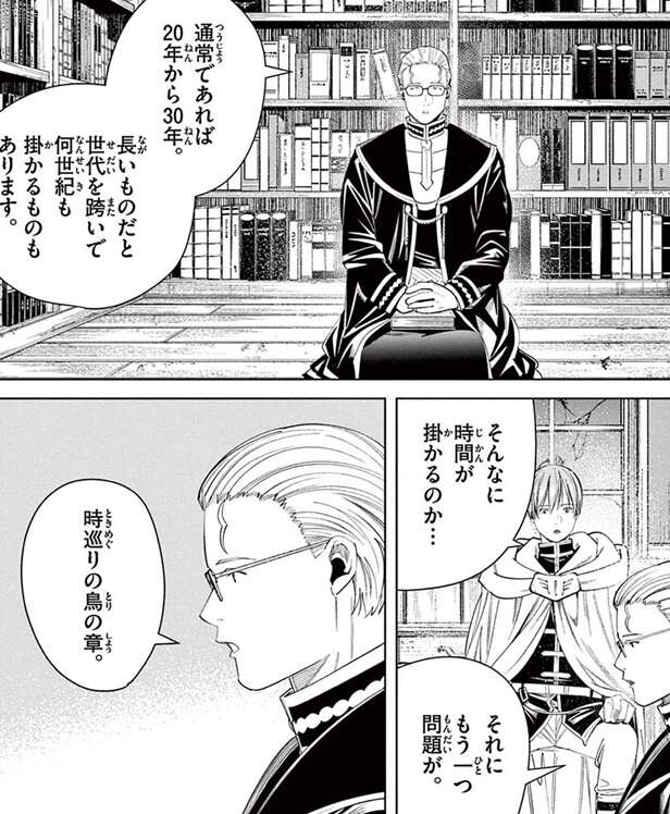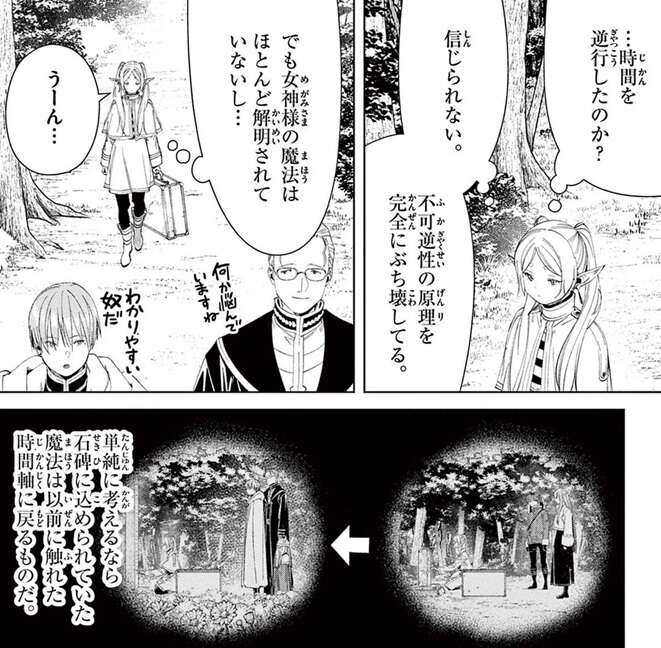 ようやく女神の石碑に関する事が書かれた書物を見つけますが、聖典には女神様の魔法そのものは記されておらず、暗号文を解読する必要がある、とハイターに教えてもらいます。フリーレンが見つけた記述は聖典の時巡りの鳥の章にあり、通常だと解読に20年から30年かかるとハイターは言います。さらに時巡りの鳥の章からは千五百年の間、一度も女神様の魔法は見つかった事はなく、解読にはさらに時間がかかる可能性が出てきます。